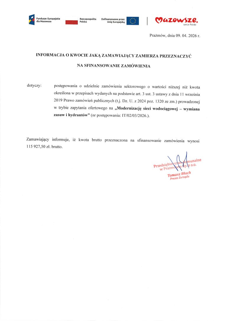 Prażmów, dn. 10.04.2026 r. INFORMACJA O KWOCIE JAKĄ ZAMAWIAJĄCY ZAMIERZA PRZEZNACZYĆ NA SFINANSOWANIE ZAMÓWIENIA dotyczy: