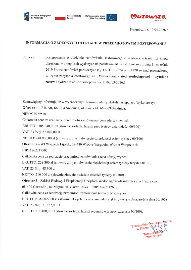 Prażmów, dn. 10.04.2026 r. INFORMACJA O ZŁOŻONYCH OFERTACH W PRZEDMIOTOWYM POSTĘPOWANIU dotyczy: postępowania o udzielnie
